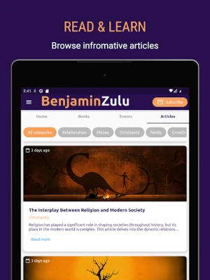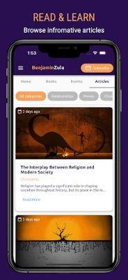 Πέρα από την πρόσβαση σε βιβλία και εκδηλώσεις, η εφαρμογή σας προσκαλεί να εξερευνήσετε έναν θησαυρό προσωπικών άρθρων του Benjamin Zulu. Βυθιστείτε σε βαθυστόχαστες αναλύσεις και πρακτικές συμβουλές γύρω από την προσωπική ανάπτυξη, τις σχέσεις και την επικοινωνία, αλληλεπιδρώντας με τις ιδέες του στον δικό σας ρυθμό. Επιπλέον, ανακαλύψτε επιπρόσθετους πόρους, όπως αποκλειστικό περιεχόμενο, ειδικά βίντεο και διαδραστικά εργαλεία, όλα σχεδιασμένα για να ενισχύσουν περαιτέρω την κατανόηση και την εξέλιξή σας σε κάθε πτυχή της ζωής. Αυτή η πλατφόρμα είναι ο προσωπικός σας σύμβουλος για διαρκή βελτίωση.